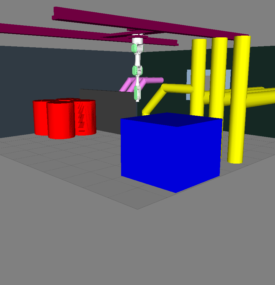 We will use the SimplePA10Demo scene for demonstration of pathplanning. This scene has a Mitsubishi PA-10 robot mounted on a gantry. To move from one location in the scene to another requires pathplanning to avoid collisions.